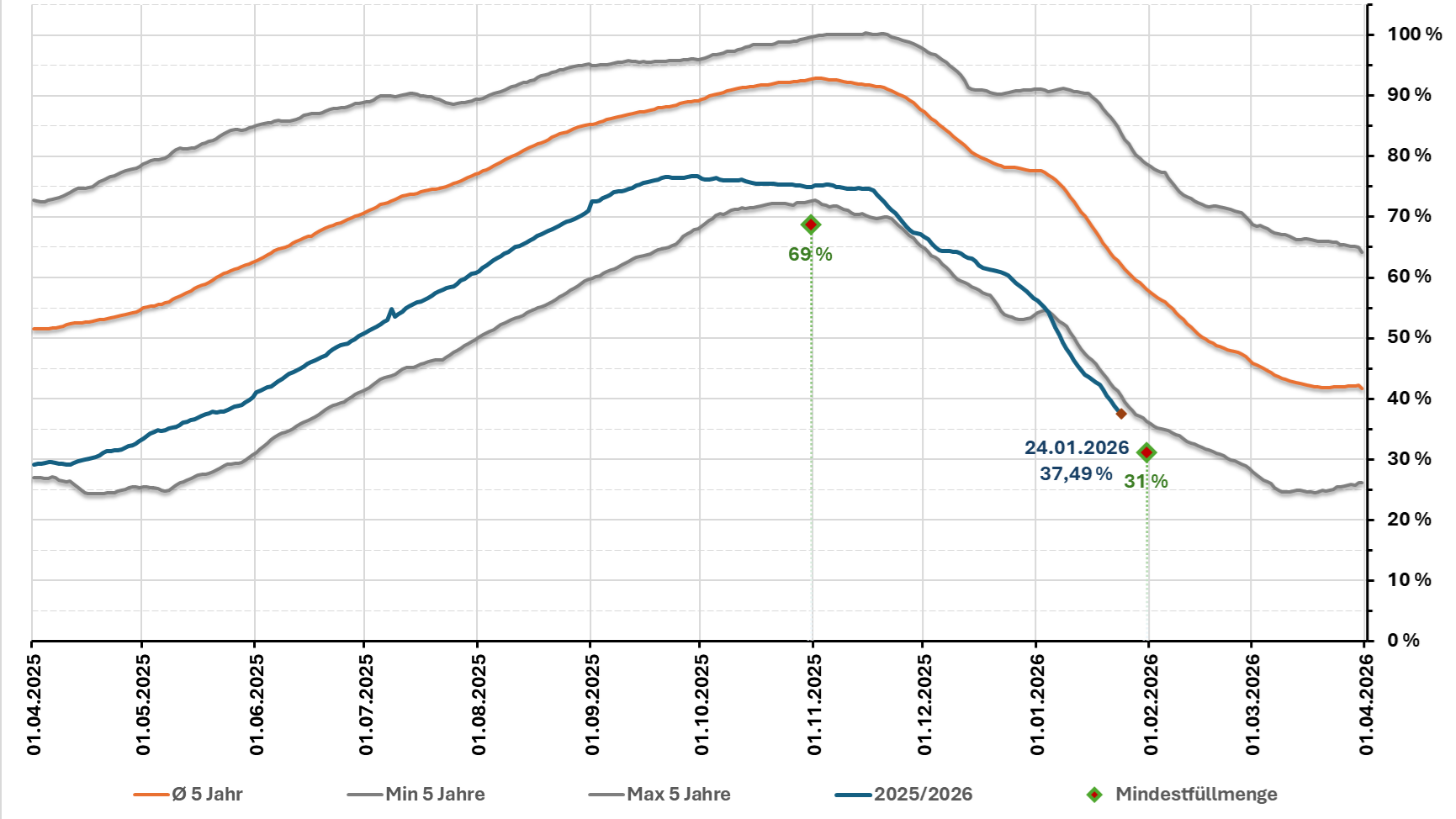Neben dem Pipeline- und LNG-Gas stellten immer, insbesondere in den Wintermonaten, die deutschen Gasspeicher eine wichtige Versorgungssicherheitssäule dar. Aber gerade diese dritte Säule liefert aktuell alarmierende Signale. In der jüngsten Vergangenheit wurden Gasspeicherkapazitäten reduziert, die Speicherbefüllung für den Wintervorrat 2025/26 wurde mit ca. 75 % (Stand 01.11.25) gegenüber dem Vorjahr (98 % - Stand 01.11.24) deutlich geringer vorgenommen und die seit Jahresbeginn anhaltende, kühle Wettersituation haben den allgemeinen Heizbedarf signifikant erhöht, sodass die gesamte deutsche Gasspeicherbefüllung auf < 38% (37,49%- Stand 24.01.26) gesunken ist.
